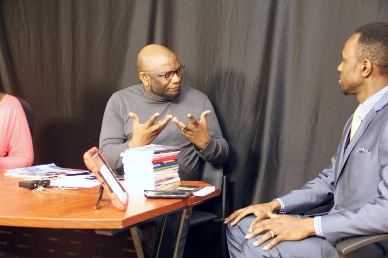 Apostle discussing his books on the table with Peculiar Vision International President - Pastor Shola Jordan Adeoye on social media platform.