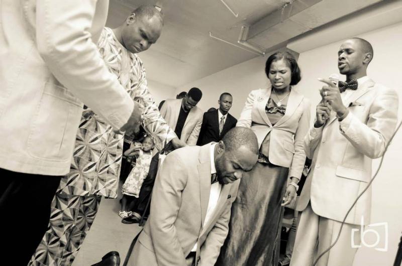 Apostle Bassey alongside Lady Apostle, Pastor Showunmi, Pastor Elijah praying during Brother John Olajide's Album launch.